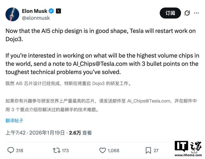 IT之家1月19日消息永星速配永星速配,今天早间,马斯克在X平台发文宣布永星速配,随着AI5芯片设计完成,特斯拉将重启超级计算机项目Dojo3的开发工作。