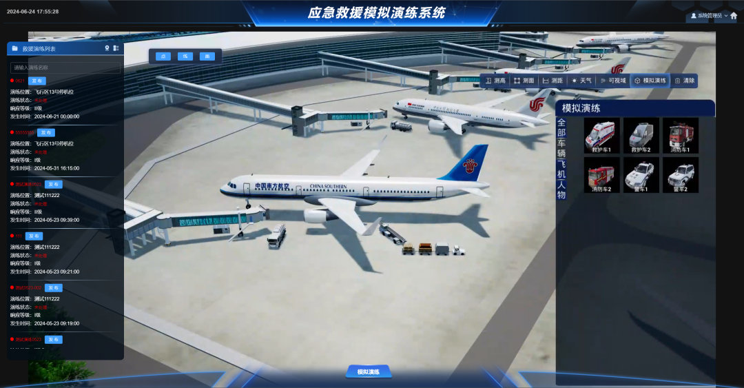 系统为机场提供预案管理、模拟演练、应急指挥、总结评估、资源调度及应急培训等应急管理功能。日常管理中,可依托空间智能软件技术模拟各类应急事件的处置流程;当航空器故障、车辆故障等突发状况发生时,可通过平台音视频功能统一指挥调度消防、救护、公安等力量,保障应急事件高效处置,最大限度降低人身与财产损失。最终实现事前监测预警、事中指挥调度、事后复盘评估的全闭环应急管理。
