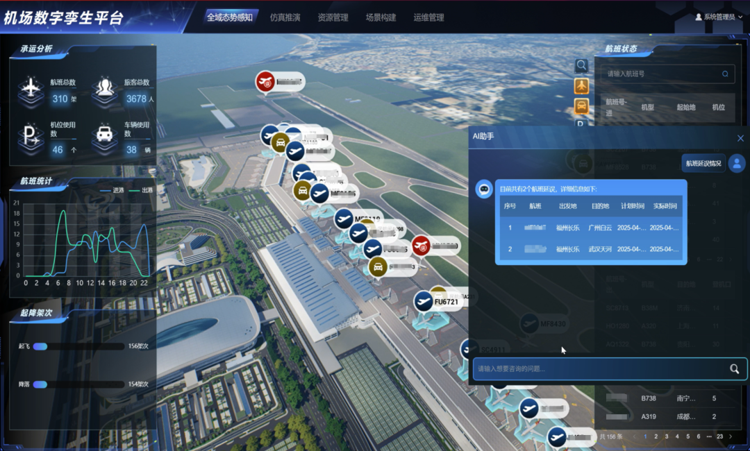 同时,系统结合AI大语言模型和空间智能软件技术,打造了智能交互式智能助手,集成民航知识交互、航班延误分析、保障任务超时分析等能力,助力机场运行从“经验驱动”向“数智驱动”转型。