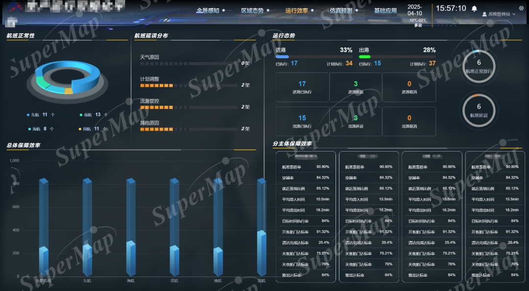 系统依托动态可视化图表,可实时呈现机场核心运行指标,涵盖保障效率、运行态势、航班运行品质等多维度评估内容。