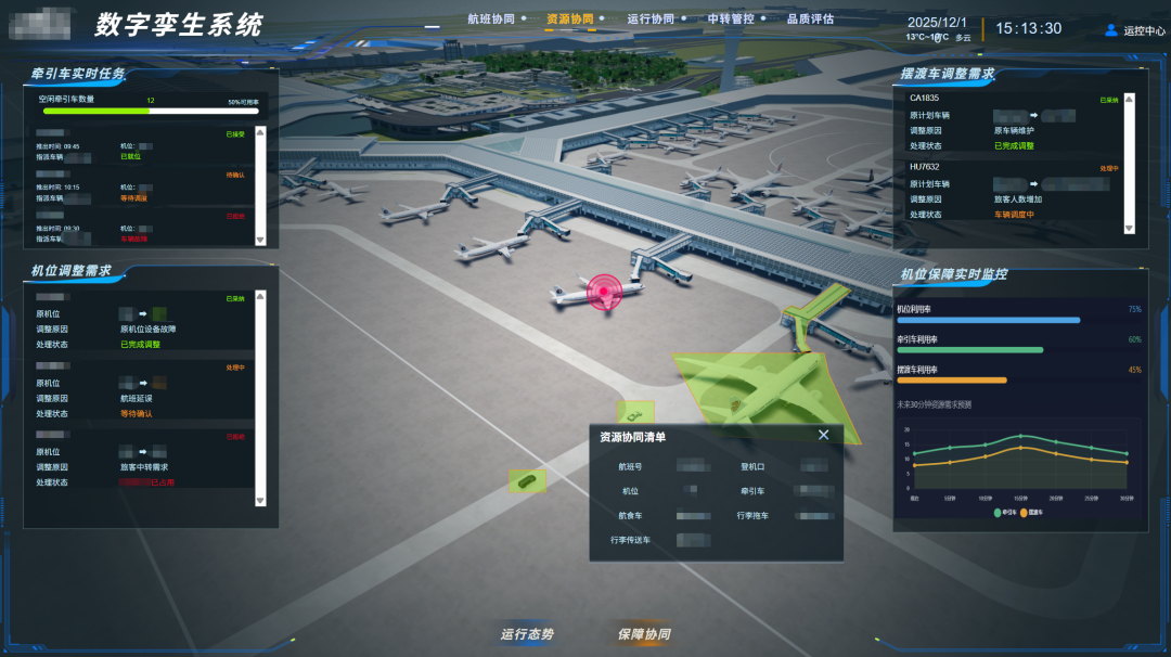 系统可智能推荐放行排序优化、保障任务调整、机位调整等资源调配方案,并实现与航班信息及运行资源管理系统、地面服务管理系统、A-CDM系统等外部平台的高效联动与协同运行。